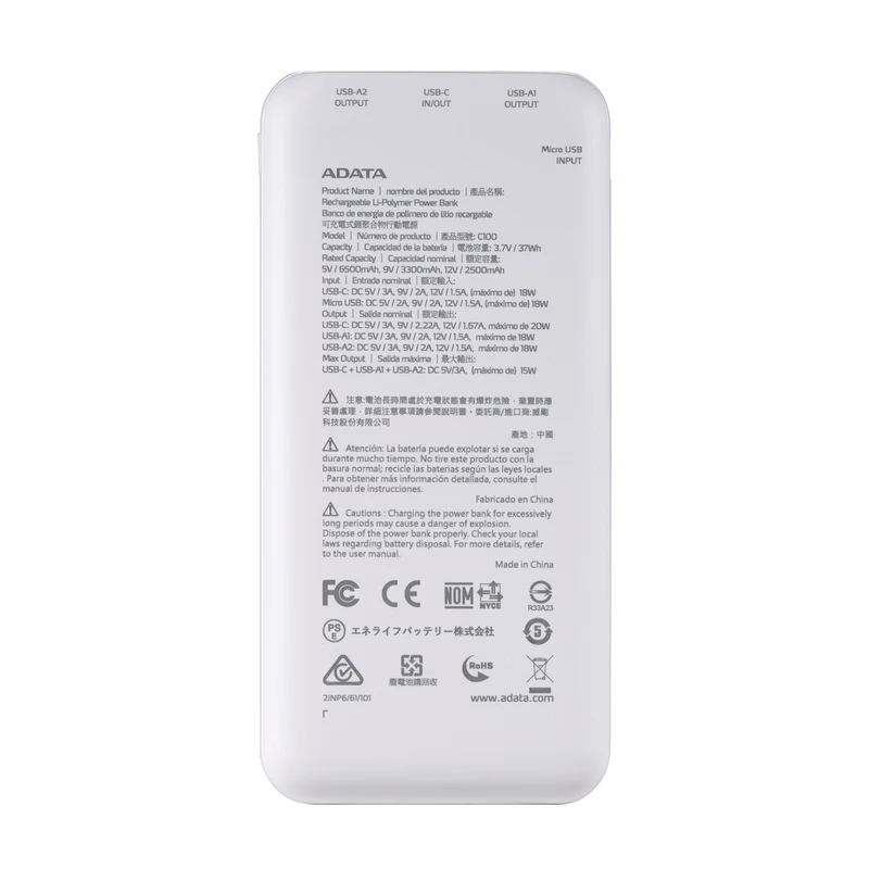 پاوربانک ای دیتا مدل ADATA C100 ظرفیت 10000 میلی آمپر ساعت