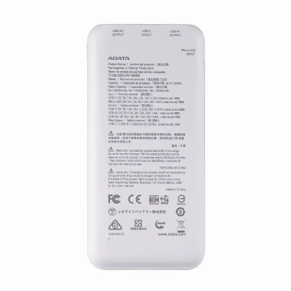 - مشخصات فنی خروجی دستگاه شامل USB-C DC ۵ ولت / ۳ آمپر، ۹ ولت / ۲.۲۲ آمپر، ۱۲ ولت / ۱.۶۷ آمپر، ۲۰ وات حداکثر USB-A۱ DC ۵ ولت / ۳ آمپر، ۹ ولت / ۲ آمپر، ۱۲ ولت / ۱.۵ آمپر، ۱۸ وات حداکثر USB-A۲ DC ۵ ولت / ۳A، ۹ ولت / ۲ آمپر، ۱۲ ولت / ۱.۵ آمپر, حداکثر ۱۸ وات ورودی دستگاه شامل USB-C DC ۵V / ۳A, ۹V / ۲A, ۱۲V / ۱.۵A, ۱۸W Max Micro USB DC ۵V / ۲A, ۹V / ۲A, ۱۲V / ۱.۵A, ۱۸W Max