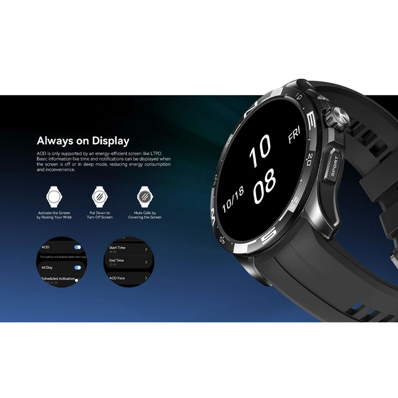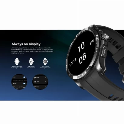 - قابلیت های ویژه امکان شخصیسازی واچفیس, نمایش روز و ساعت, نمایش وضعیت آب و هوا, هشدار بیدارباش, تایمر, کنترل موسیقی, امکان کنترل دوربین گوشی, چراغ قوه, ماشین حساب
